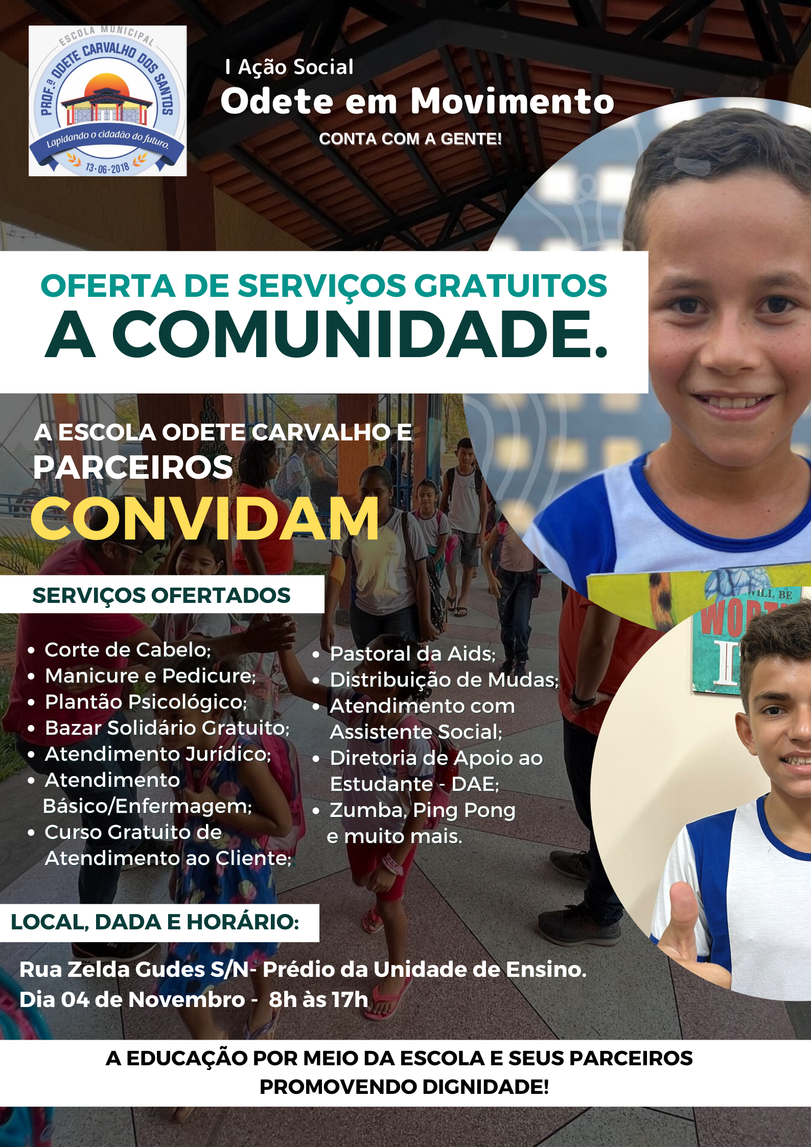 A Escola Municipal Professora Odete Carvalho dos Santos e parceiros apresentam e convidam à comunidade escolar para participarem da I Edição do Projeto Odete em Movimento, que possui como objetivo oferecer dignidade as pessoas por meio de serviços gratuitos articulados em parceria com a sociedade civil, poder público e cidadãos.